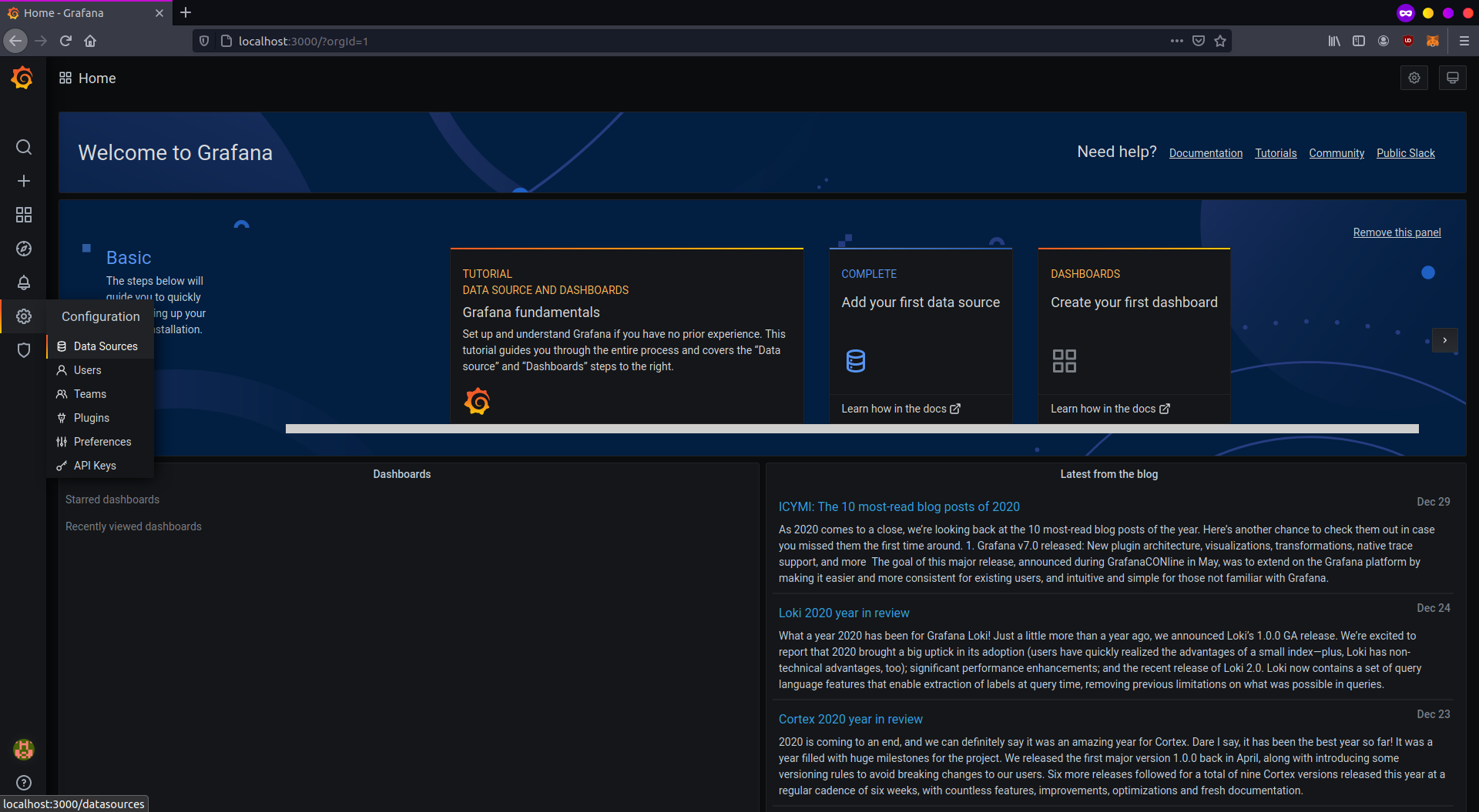 You will be redirected to the Grafana home page. First, set up your source data. Click on the configuration icon in the left bar and select "Data sources".