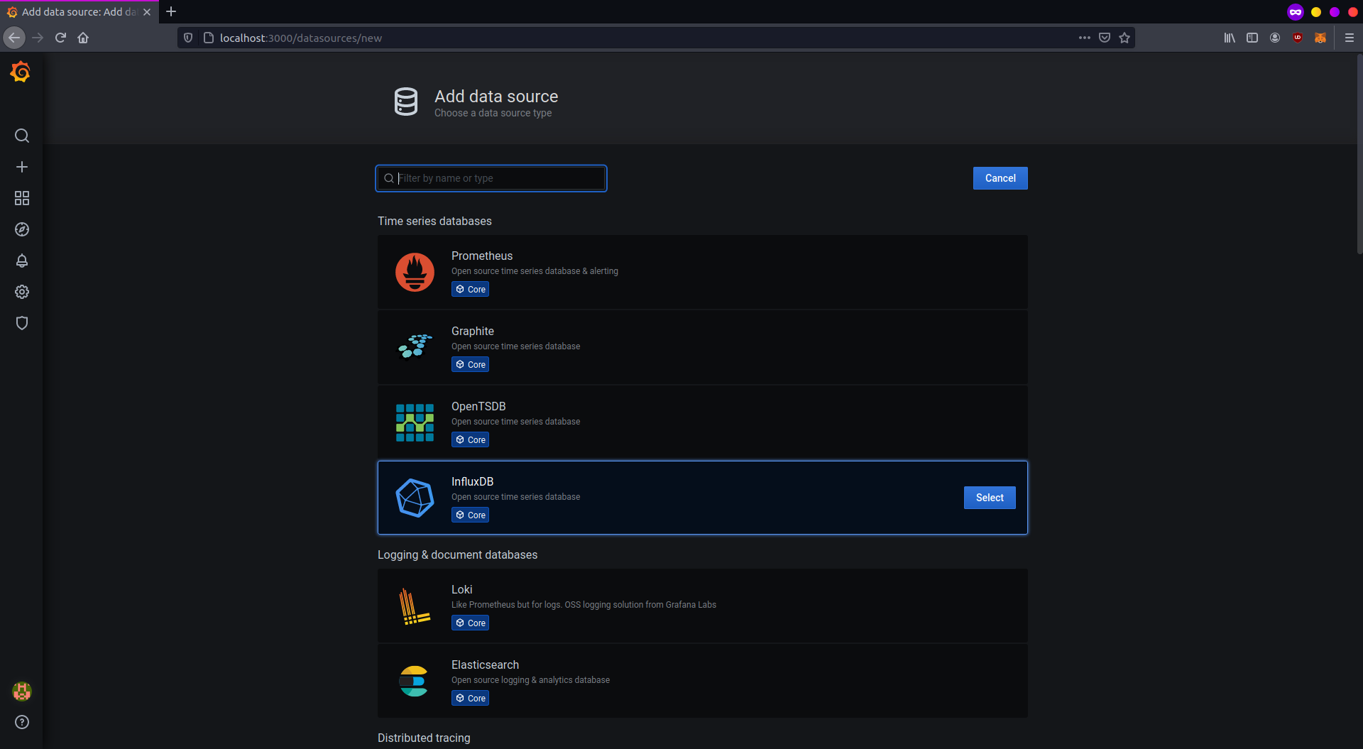 For this setup, select "InfluxDB" and proceed.