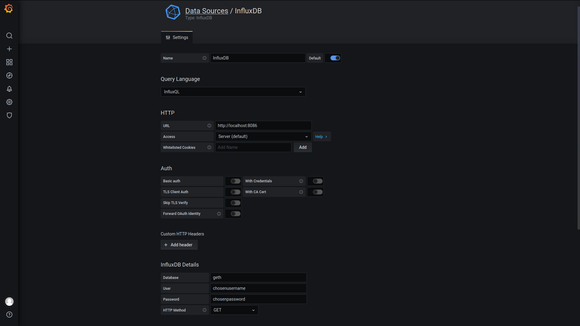 Data source configuration is pretty straight forward if you are running tools on the same machine. You need to set the InfluxDB address and details for accessing the database. Refer to the picture below.